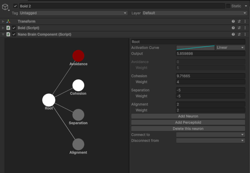 Each of the separation, cohesion and alignment rules are implemented with a neuron and their effects are merged by the root neuron. Settings the weights for each connection changes the swarming behaviour.